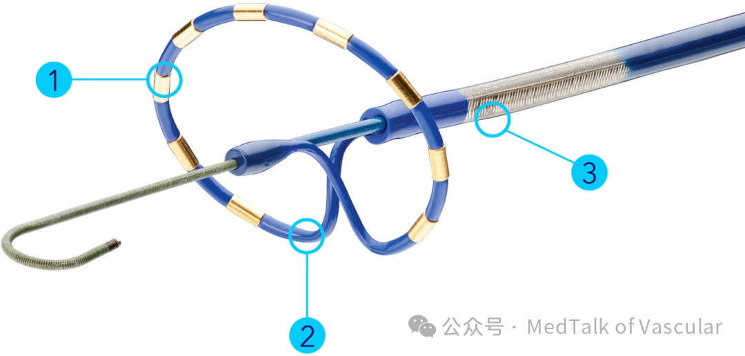圖:1:9個電極,用于感應、消融和起搏;2:直徑為25mm的環;3:9Fr軸,帶雙向轉向功能
